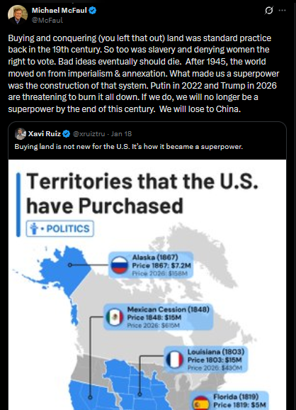 Buying and conquering (you left that out) land was standard practice back in the 19th century. So too was slavery and denying women the right to vote. Bad ideas eventually should die. After 1945, the world moved on from imperialism & annexation. What made us a superpower was the construction of that system. Putin in 2022 and Trump in 2026 are threatening to burn it all down. If we do, we will no longer be a superpower by the end of this century. We will lose to China.