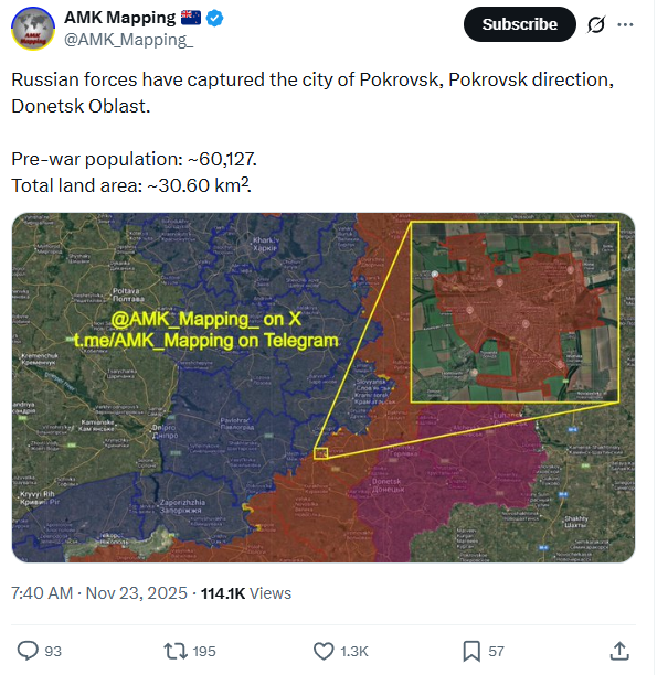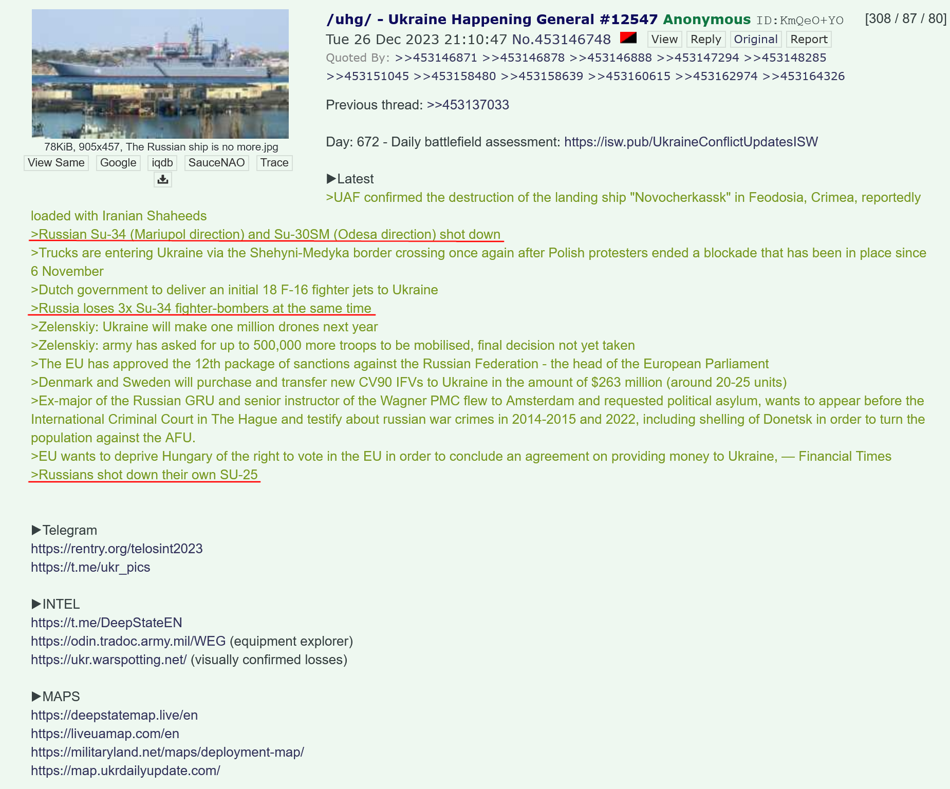 Previous: >>526646785Day 1,429 – Daily assessment: understandingwar.org/analysis/russia-ukraine/#research▶Latest>US envoy Wittkoff: Agreement on Ukraine in its final stages>Oil depot of Tamanneftegaz at the Volna port is on fire after several strikes>Zelenskyy meeting with Trump expected to take place on Thursday>Witkoff and Kushner will travel to russia on Thursday for talks with putin>US seized russia-linked tanker "Sagitta" in the Caribbean sea>Moldova officially begins withdrawing from CIS>Trump invited both monke and Zelenskyy to Gaza peace council>7th Air Assault Corps: Around 370 russians killed/wounded near the Pokrovsk area over the past week>Thermal power plant in Kursk on fire after a Ukrainian drone strike, electricity and water are out>Bilhorod governor says local businesses bought laser air defense systems as a last resort to shield factories from constant Ukrainian strikes>Syrskyi confirms Ukraine has plans for offensive operations in 2026>Melitopol substation struck, most of occupied Zaporizhzhia without power>Italy seizes russian tanker with 33k tons of steel>Grozny is on lockdown because Kadyrov's son Adam got into a car crash>China halts all electricity imports from russia>russia losing 25,000 troops monthly - Mark Rutte>Reuters reports that the US may attack Iran within the next 24 hours.>Emergency situation will be declared in energy and power sector - Zelenskyy>At least 20% of russia's shadow tanker fleet has been stopped - Zelenskyy>Zelenskyy says Ukraine is finalizing a historic security deal with the US▶Telegramrentry.org/telosint2023t.me/ukr_pics▶Intelt.me/DeepStateENodin.tradoc.army.mil/WEG (equipment explorer)ukr.warspotting.net (visually confirmed losses)▶Mapsdeepstatemap.live/enliveuamap.com/en▶DISPOSABLE SOLDIER (diary of a RU mobik)TOURS 1-4: files.catbox.moe/mpcw7p.zip▶12 min of TZD in one ditch (Pokrovsk area) - 28 killedfiles.catbox.moe/sxbxfb.mp4