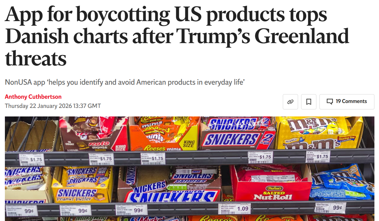 >It is not the only boycott-related app to see a surge in downloads in Denmark in recent days, with Made O’Meter also entering the top 10, according to data from Appfigures.>The two apps have also proved popular in other Nordic countries, including Norway, Sweden and Iceland.have (You) tried it?