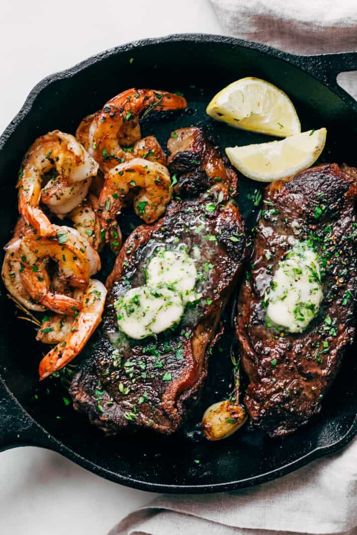 https://www.littlespicejar.com/garlic-butter-skillet-steak-and-shrimp/