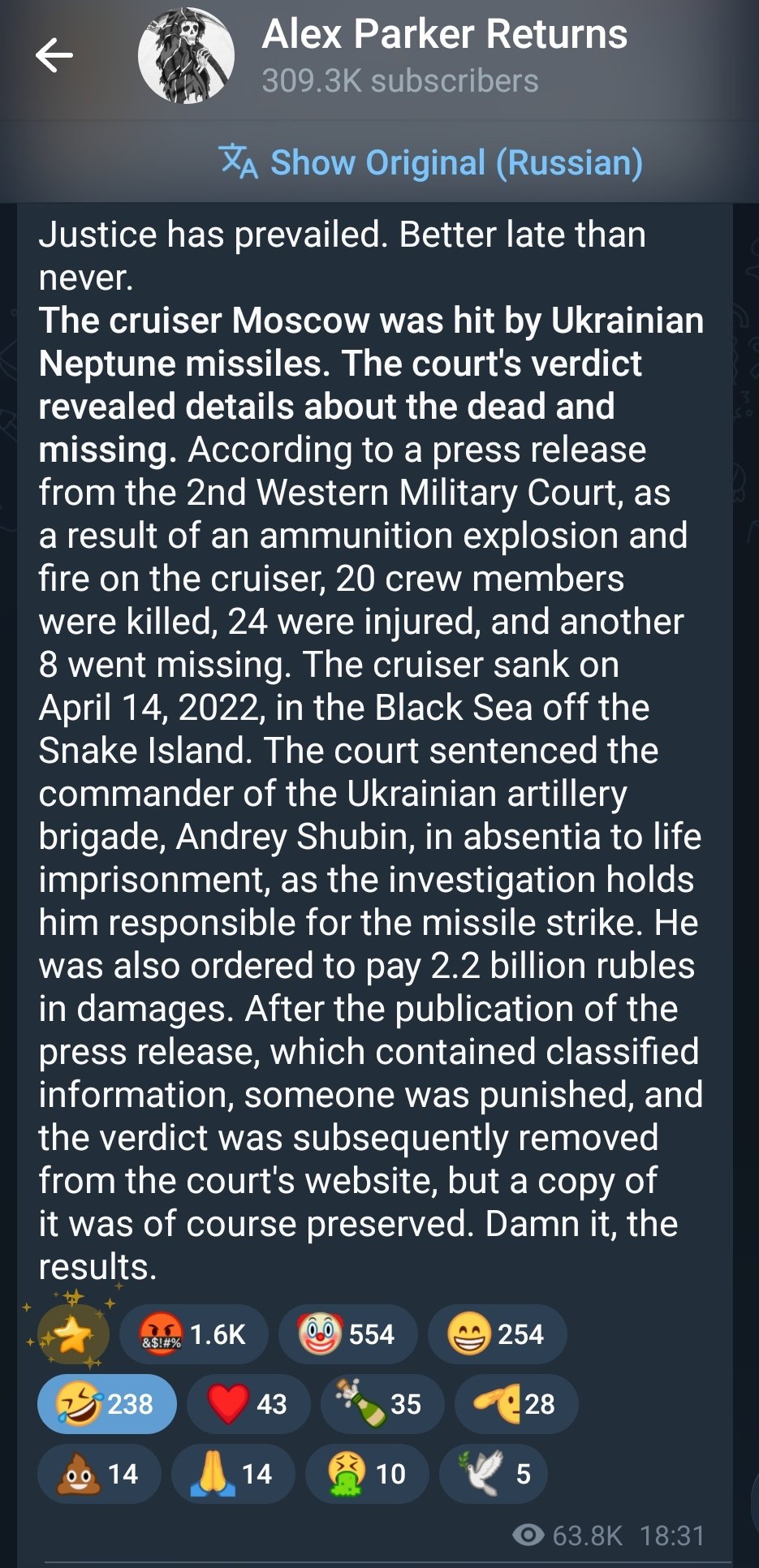 >>526760827It is, the court also confirmed that it was hit by Ukranian Neptune missiles and did not sink because of "bad weather" or whatever the official cope was.Oh, and that press release was deleted shortly after it got posted on the court's website kek.