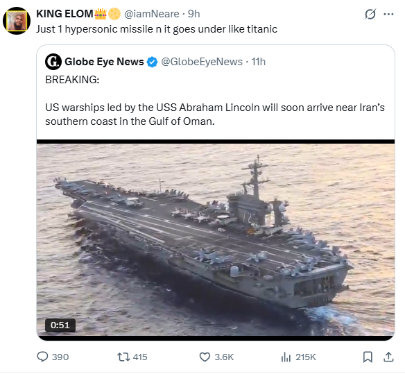 >They will sink an US Carrier with their hypersonic meme weapons if they dare touching based and trad IranLmao what a dumb nigger