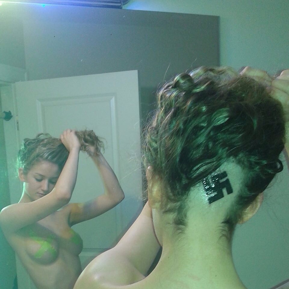 >>526764029thats clearly not spraypaint. Hard edges, consistent size of stroke. Looks like a big paintmarker.There's no fucking way you'd get two identical solid "dots" above the eyes with zero overspray from an inexperienced graffiti person.