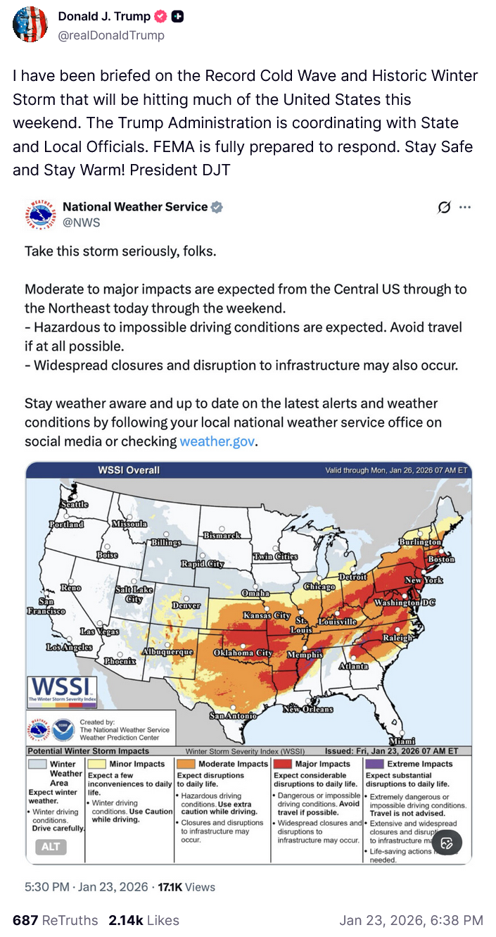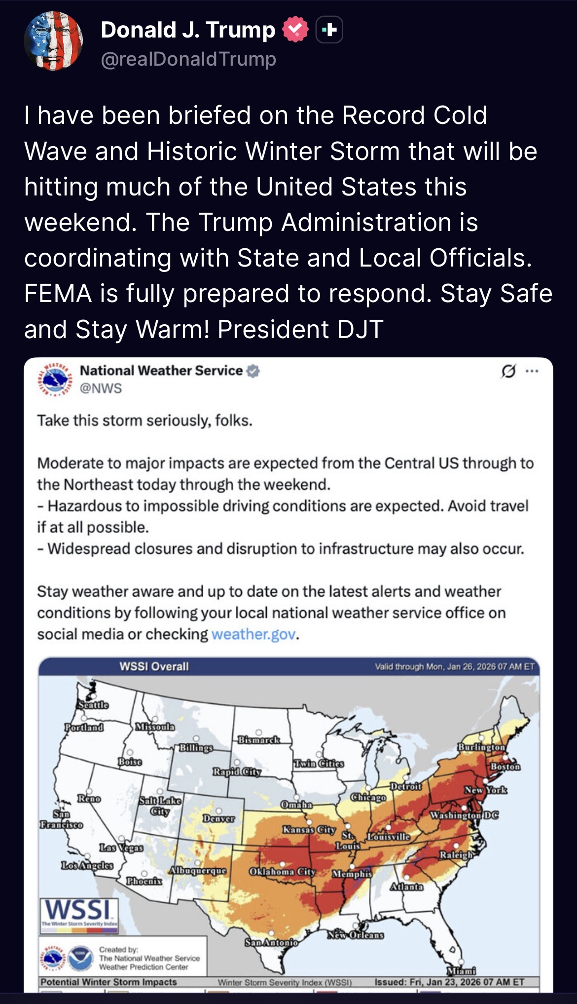 >tweetI have been briefed on the Record Cold Wave and Historic Winter Storm that will be hitting much of the United States this weekend. The Trump Administration is coordinating with State and Local Officials. FEMA is fully prepared to respond. Stay Safe and Stay Warm! President DJT