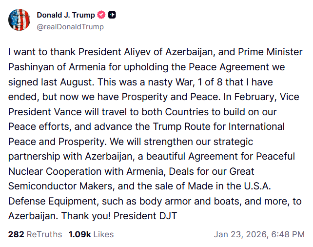 >tweetI want to thank President Aliyev of Azerbaijan, and Prime Minister Pashinyan of Armenia for upholding the Peace Agreement we signed last August. This was a nasty War, 1 of 8 that I have ended, but now we have Prosperity and Peace. In February, Vice President Vance will travel to both Countries to build on our Peace efforts, and advance the Trump Route for International Peace and Prosperity. We will strengthen our strategic partnership with Azerbaijan, a beautiful Agreement for Peaceful Nuclear Cooperation with Armenia, Deals for our Great Semiconductor Makers, and the sale of Made in the U.S.A. Defense Equipment, such as body armor and boats, and more, to Azerbaijan. Thank you! President DJT