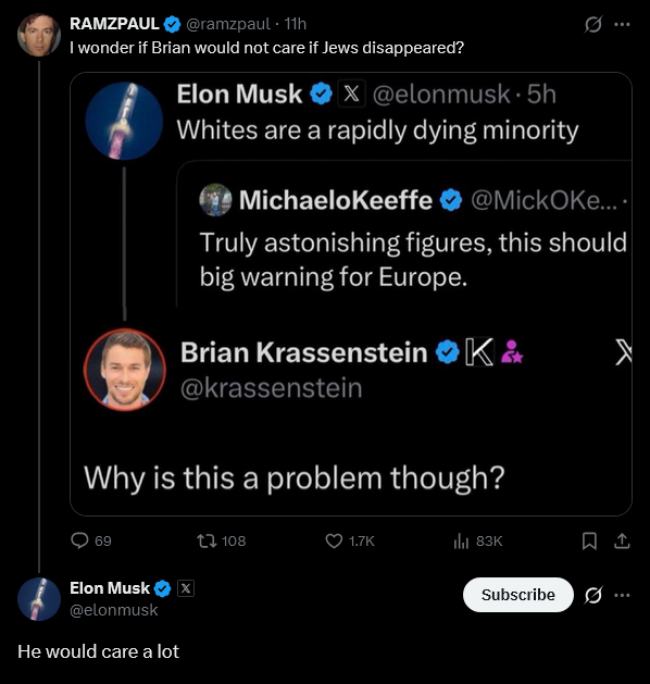 Well considering Elon Musk thinks that Jews are "peak white", this jew implied that he is posting as a "white" person "i don't care if we disappear". but musk exposed him: "you actually meant to say that you don't care if WE disappear but you don't want JEWS to disappear".