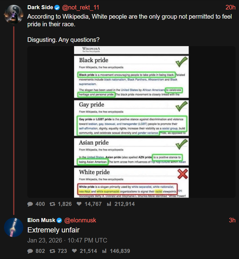 Elon is getting force fed jpills by his own platform, kekhttps://x.com/elonmusk/status/2014862377263476887