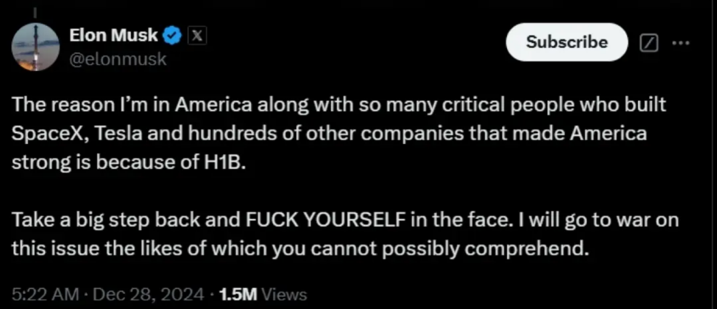 ahj yes elon musk the savior of the white race who just said a couple months ago that he would go to total war on behalf of his h1-b slaves and to fuck our fucking faces if we dont like being replaced by them
