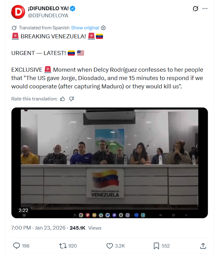 >Venezuelan leader says she was threatened with death after Maduro's capture: '15 minutes to respond'>Leaked video of meeting shows previously unseen version for the general public>Venezuela's interim president, Delcy Rodríguez, claimed that she and other Chavista leaders were threatened with death by American authorities on the day of Nicolás Maduro's capture, and that they had 15 minutes to choose between cooperation or death.>Delcy's statements came to light after the leak of a video recording of a meeting chaired by then Venezuelan Minister of Communications and Information, Freddy Ñáñez.>"It hurts... to have to assume responsibility in these circumstances," said Delcy, in a phone call with Ñáñez, who held the phone on speakerphone close to a microphone. "The threats began the first minute they kidnapped the president [Maduro]. They gave Diosdado [Cabello, Minister of the Interior], Jorge [Rodríguez, Delcy's brother and president of Congress], and me 15 minutes to respond, or they would kill us.">The matter was first reported by the Venezuelan website La Hora de Venezuela, and subsequently picked up by other media outlets. The Guardian newspaper pointed out that the recording appears to have been made from a video conferencing platform.>According to the president's account, the American side initially reported that Maduro and his wife, Cilia Flores, had been killed.>Recently, the president of Cuba, Miguel Díaz-Canel, stated that he had a telephone conversation with Delcy Rodríguez, to whom he expressed "support and solidarity," in the first direct contact between the two.