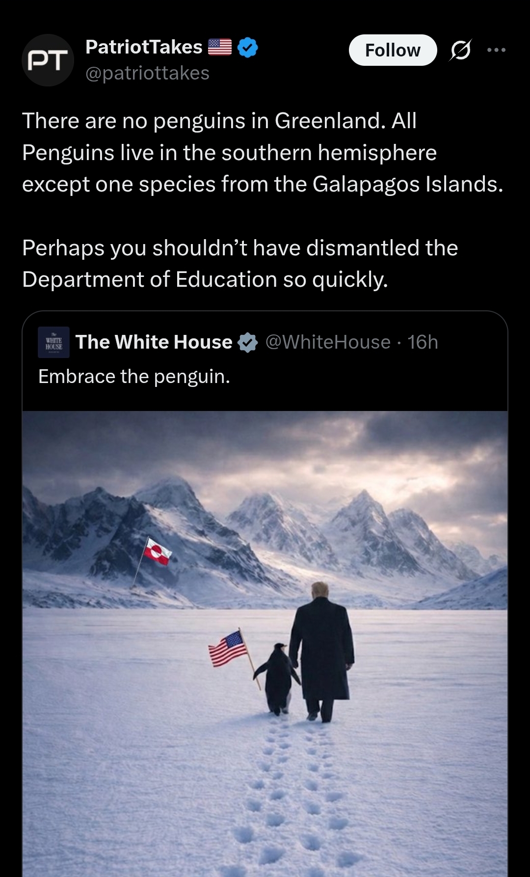 >>526807229I thought this was about taking land in Antarctica, he's clearly with an Emperor.Also made me read up on the auk, shane it was hunted to death for feathers and eggs.