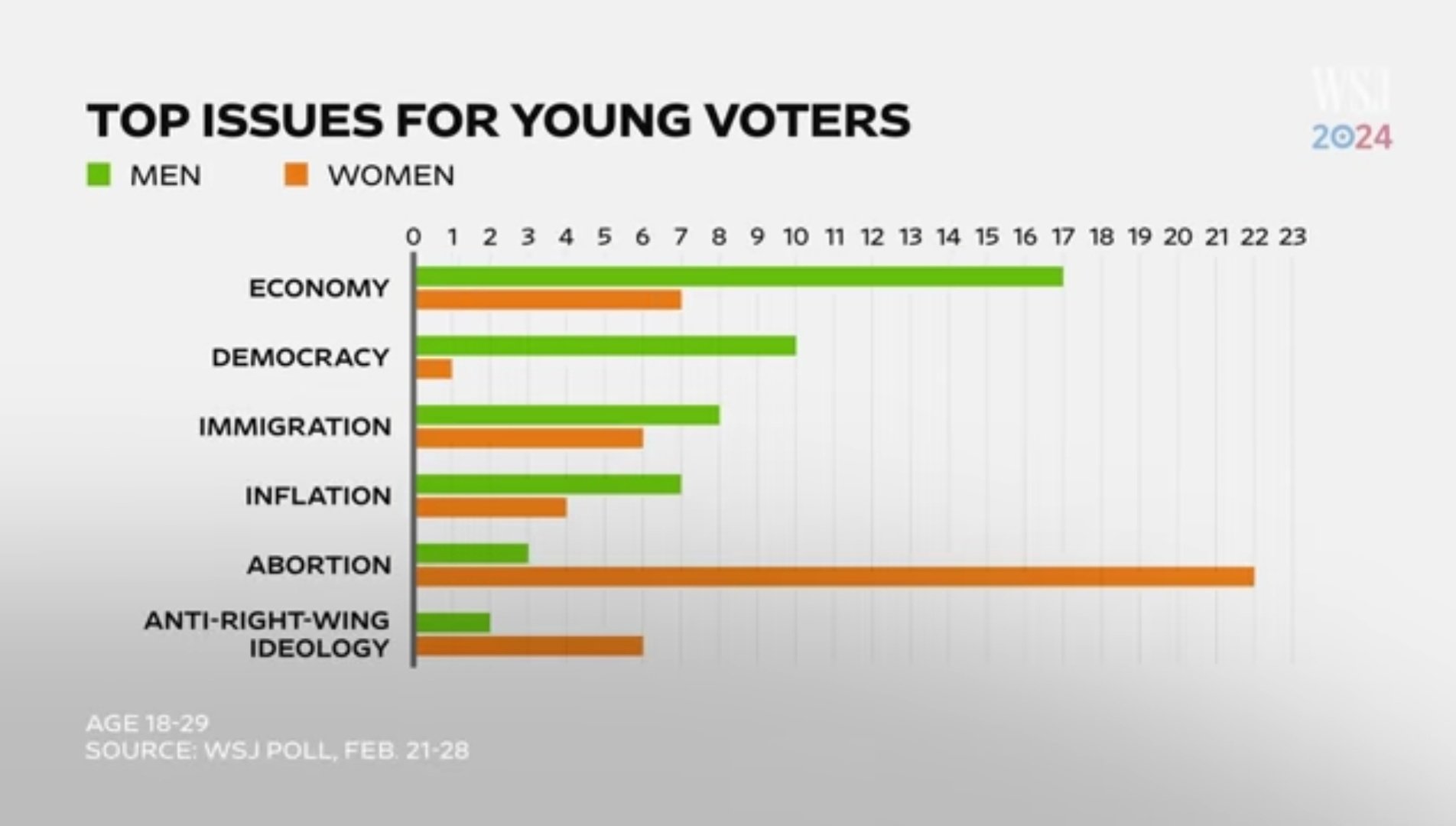 Time and time again data has shown women overwhelmingly only care about things they can benefit from directly. While men surveyed care about inflation, democracy, immigration, economy - women overwhelmingly care about abortion... and that's mainly it. If half the population dedicates their votes to nonsense that doesn't actually fix real problems then maybe that demographic shouldn't get to vote. It's a matter of responsibility and duty, and those aren't traits evolutionarily selected for in women.