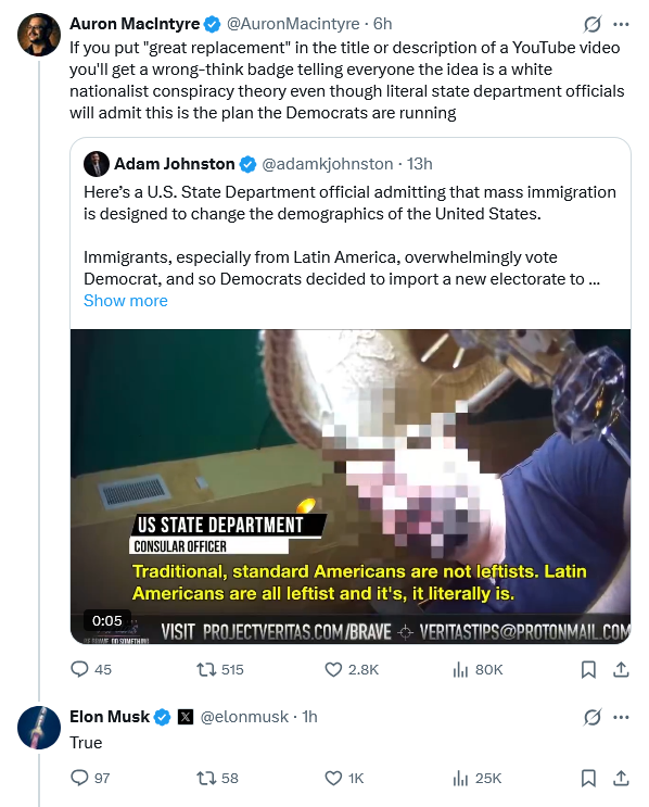 >Here’s a U.S. State Department official admitting that mass immigration is designed to change the demographics of the United States.>Immigrants, especially from Latin America, overwhelmingly vote Democrat, and so Democrats decided to import a new electorate to secure permanent power.https://x.com/adamkjohnston/status/2014683113981444510Long montage of anti white videos and articles:https://www.bitchute.com/video/8r73T6AZL76T/>>>/wsg/5962699Over 400 related images:https://archive.4plebs.org/pol/thread/435180517/https://archive.4plebs.org/pol/thread/435203649/>What are We Doing to White People? https://www.youtube.com/watch?v=BFpUjyM0orQ