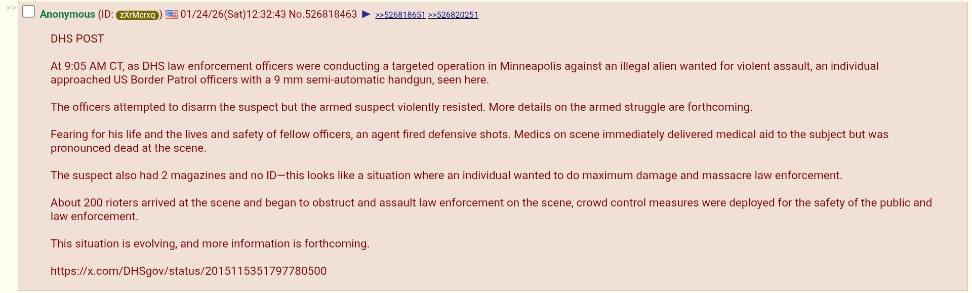 >>526829761>>526829938>>526831058President Trump is a politcal animal. He's also a generally sympathetic guy, not you believe that.I don't see him going to the mat for this officer.Not saying he couldn't. I just don't think he's willing to burn the political capital for what looks like - at best - wildly unprofessional use of force or at worst a street execution by a trigger happy Fed.I know how the left is going to spin it. Renee Good was a justified shoot and look how up in arms they are. You think they're going to calm down when there' s a bad shoot to wave the bloody flag?
