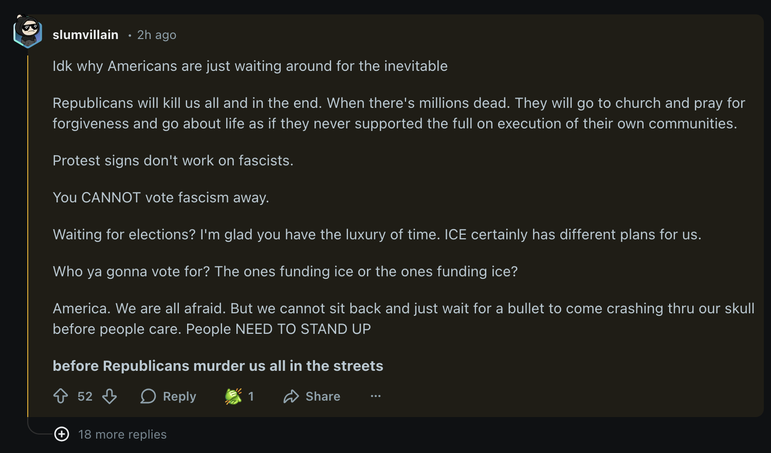 if that had happened in EVROPA there would have already been at least 5-6 dead ICE officers in retaliation...not to mention how every single city would be burning....these are the same americans boasting about supposedly being able to prevent a fascist takeover of their country....