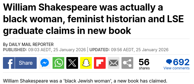 It's that time of year again, lads. February.https://www.dailymail.co.uk/news/article-15494859/William-Shakespeare-actually-black-woman-feminist-historian-LSE-graduate-claims-new-book.html