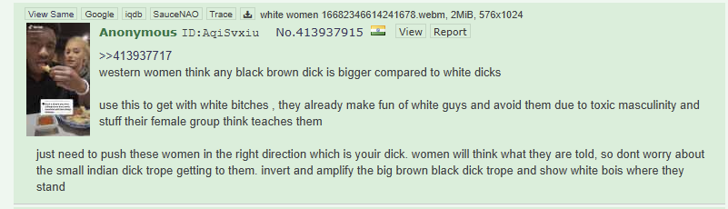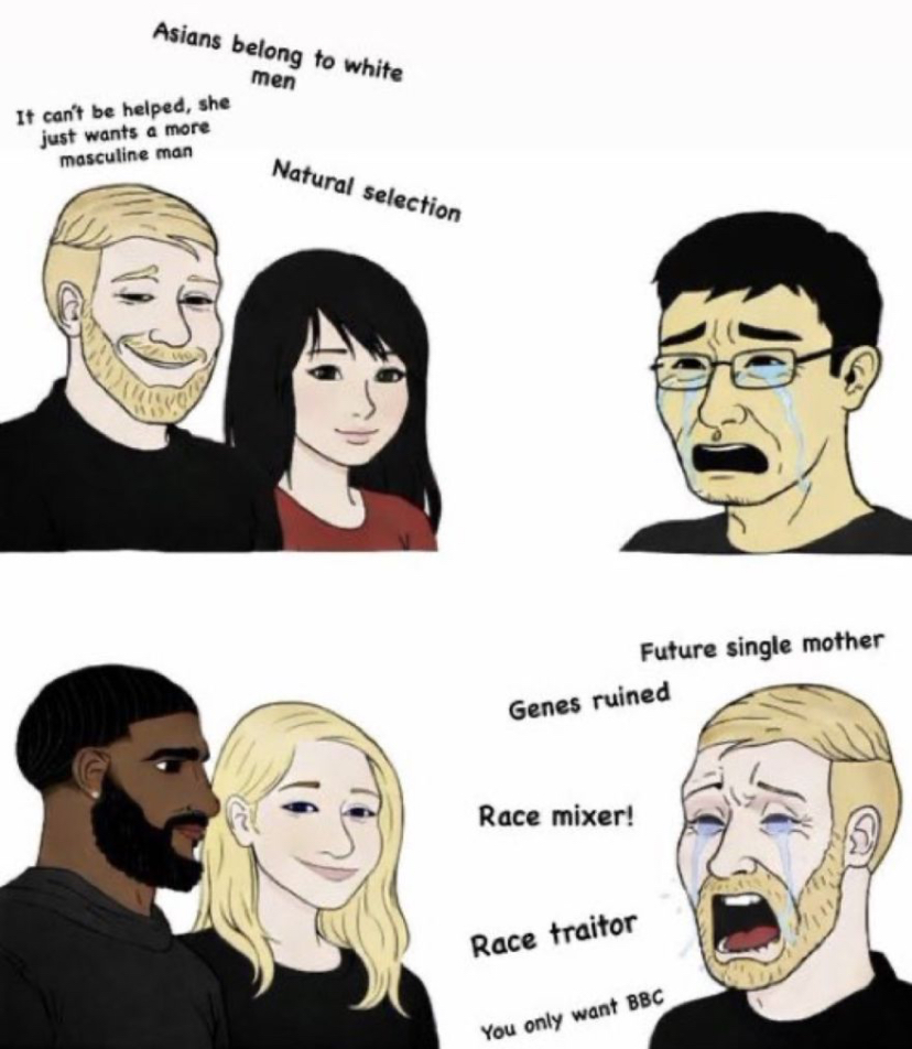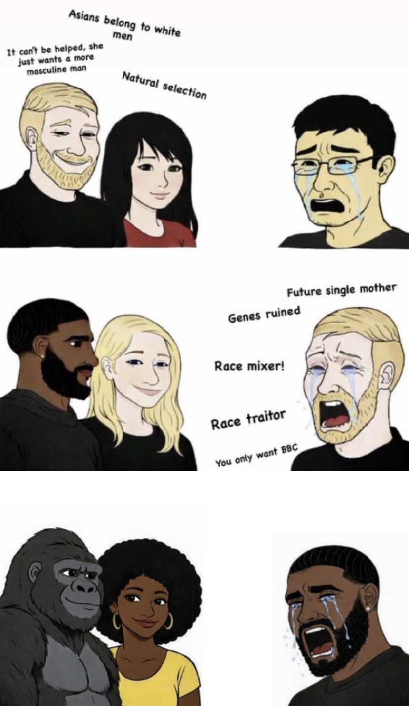 >>526862351True and image is also true. Race supremacy bull larping is cringey and should be condemned regardless of who is doing it. For white chuds it tends to come out in the context of asian women, elven women, and alien women but it's literally the same fetish as the blacked people
