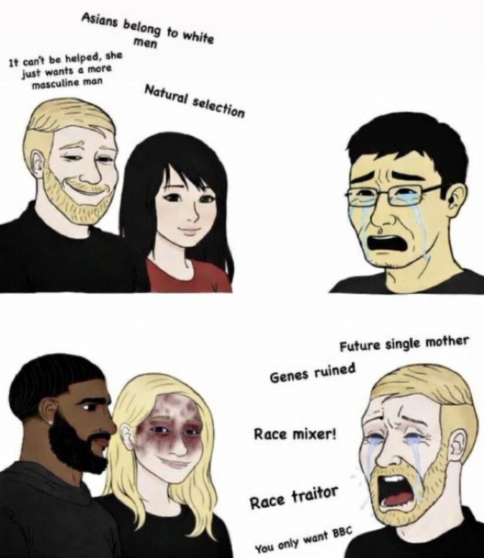 >>526862351Asians getting with whites is an upgrade for the asian, objectively. Whites getting with black is an objective downgrade. This isn't hard to understand.