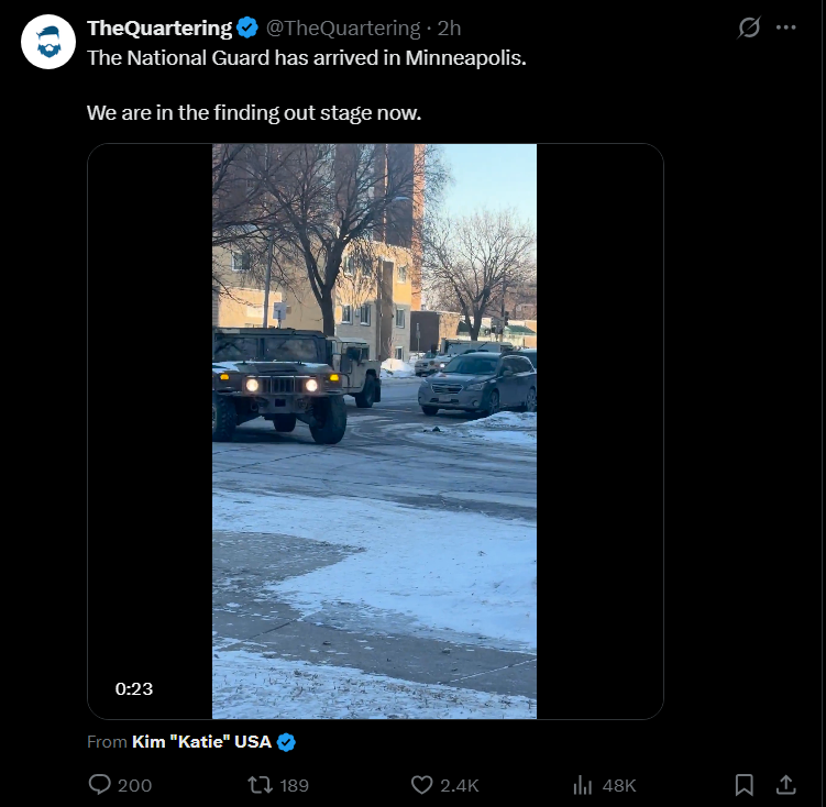 I posted in a /ptg/ that I was worried Renee Good getting shot would spark a civil war, and people insisted nothing would happen. Now we're on a second shooting and Walz is activating the National Guard to go against the feds. It's the dead of winter, we're expecting a massive ice storm in 24hrs and there are rioters out in the streets. How will this end peacefully? Just look at what Dems did in VA when they get a sliver of power. With midterms later this year it doesn't seem like we're going to make it through this year without the boog popping off. It's only January and I worry where we'll be by this summer