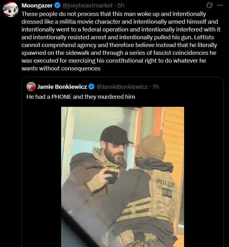 >>526866534I know exactly how you feel. You are experiencing what I and probably many others did during the memeflu lockdowns, ukraine, fentanyl floyd, take da jabs, lefty insanity event #9999.Regarding this, I share a similar situation where a old coworker keeps sharing the ICE loss of life events (the car rammer and now this dude today) and taking "humanitarian" stances. >Oh it's so unnecessary>They're just protesting>They're going acter citizensAnd I don't know how to talk to him. I know there's no use arguing. I still like him as a friend, it's when he drags up politics that makes me shrink away and disengage. Call me a non-confrontational cuck, I'm tired of losing people because of their politics yet everything else about them is likeable. You're actually in a good spot since it was brought to light and you guys set boundaries.
