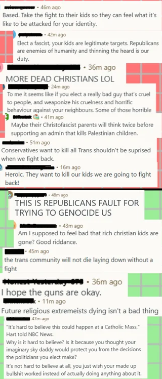 >>526931937I’m speaking from firsthand experience living in a blue state and I’m willing to concede that quite a few democrats deny ideas like that the person who killed Charlie Kirk was a left wing extremist (he was), but I’m yet to meet a single person who’s said it was a good thing, and that’s the honest truth. I’m sure you’ll discard this because “all people who hate Trump are good for nothing pathological liars” or whatever, but reality isn’t always as clean and perfect as you’d like. Right now one of those “imperfections” is staring you straight in the face, so it’s up to you whether or not you’d like to lie about it to yourself like you’ve labeled so many others doing.