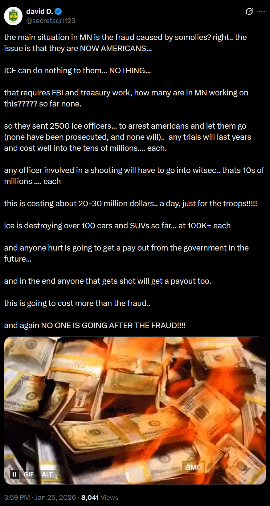 >the main situation in MN is the fraud caused by somolies? right.. the issue is that they are NOW AMERICANS...>ICE can do nothing to them... NOTHING...>that requires FBI and treasury work, how many are in MN working on this????? so far none.>so they sent 2500 ice officers... to arrest americans and let them go (none have been prosecuted, and none will).. any trials will last years and cost well into the tens of millions.... each.>any officer involved in a shooting will have to go into witsec.. thats 10s of millions .... each>this is costing about 20-30 million dollars.. a day, just for the troops!!!!!>ice is destroying over 100 cars and SUVs so far... at 100K+ each >and anyone hurt is going to get a pay out from the government in the future...>and in the end anyone that gets shot will get a payout too.>this is going to cost more than the fraud..>and again NO ONE IS GOING AFTER THE FRAUD!!!!damn ice criminals