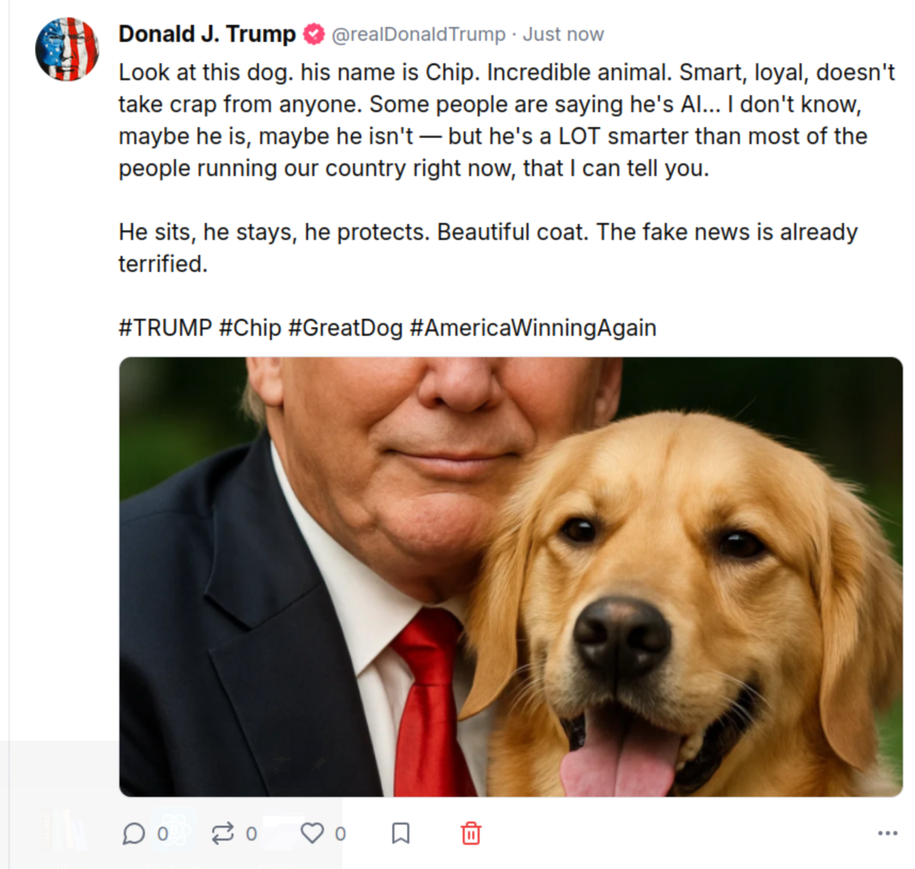 >>526950711>no dog would ever stay still with trumo>need to make an Ai dog insteadIf that shit is actually real it's even more dumb than using a cardboard dog