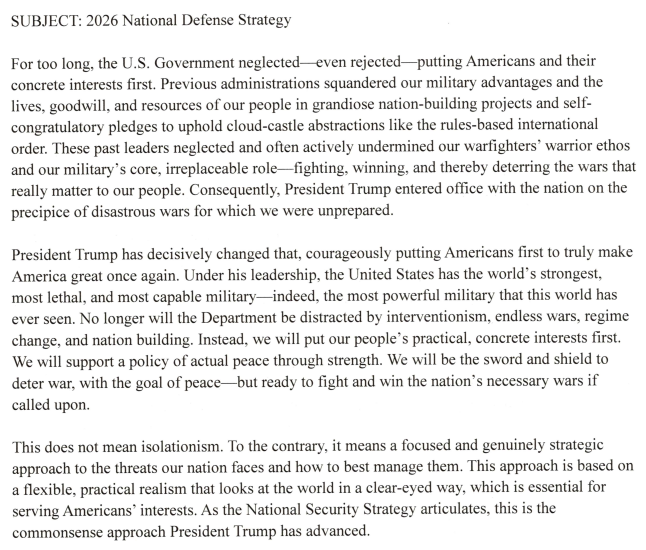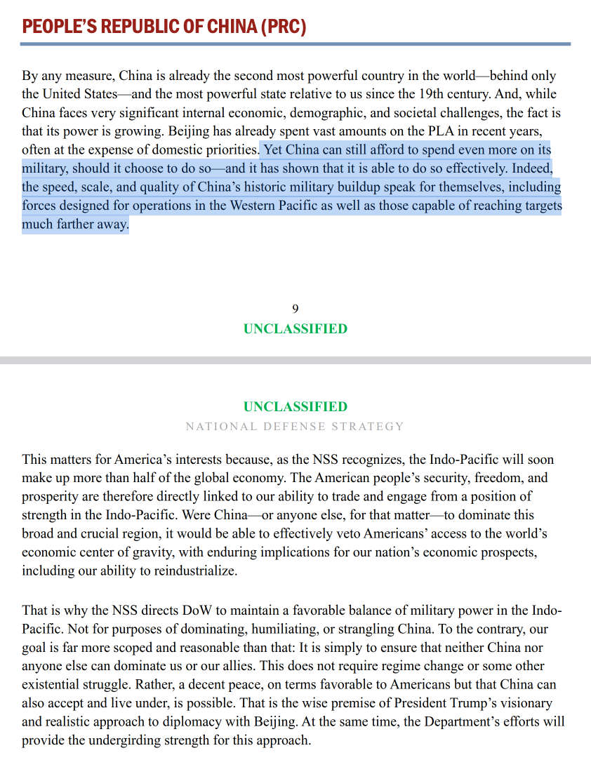 >>526957842>That is why the NSS directs DoW to maintain a favorable balance of military power in the IndoPacific. Not for purposes of dominating, humiliating, or strangling China. To the contrary, our goal is far more scoped and reasonable than that: It is simply to ensure that neither China nor anyone else can dominate us or our allies. This does not require regime change or some other existential struggle. Rather, a decent peace, on terms favorable to Americans but that China can also accept and live under, is possible. That is the wise premise of President Trump’s visionary and realistic approach to diplomacy with Beijing. At the same time, the Department’s efforts will provide the undergirding strength for this approach. This directly contradicts the two most trusted employees of Hegseth, and what they've been writing for years in their own think tank. So it may be a façade to deceive China.