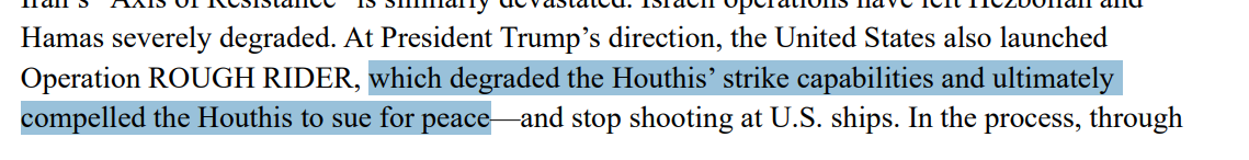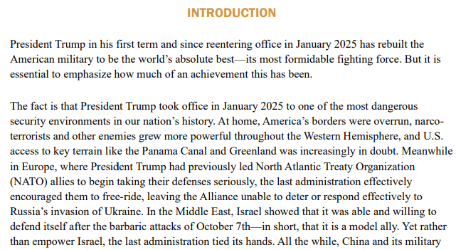 >>526958461>>526958535That is the preface, this is the introduction: >President Trump in his first term and since reentering office in January 2025 has rebuilt theAmerican military to be the world’s absolute best—its most formidable fighting force. But it is essential to emphasize how much of an achievement this has been. >In the Middle East, Israel showed that it was able and willing to defend itself after the barbaric attacks of October 7th—in short, that it is a model ally>Yet rather than empower Israel, the last administration tied its hands.