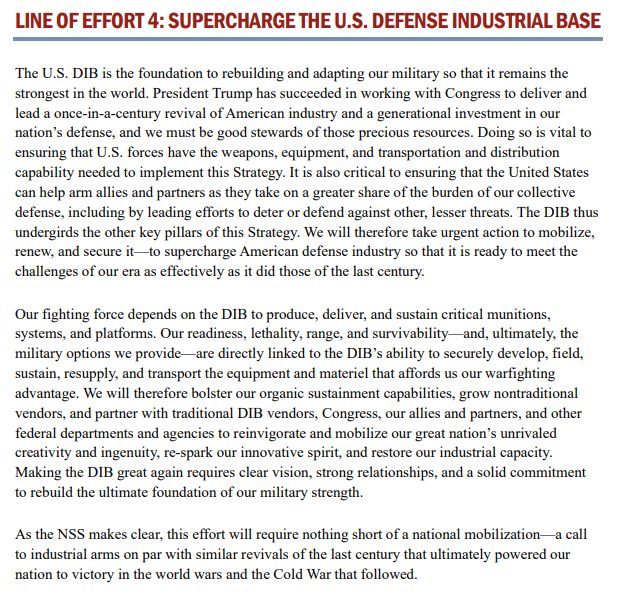 >>526958876>Do I dare ask if he gives examples of specific thinks Dolan did to rebuild the US military?Of course this official document cites how supreme leader Trump will rebuilt the US military. It's on page 29, here are some small :>President Trump has succeeded in working with Congress to deliver and lead a once-in-a-century revival of American industry and a generational investment in our nation’s defense, and we must be good stewards of those precious resources.>We will therefore bolster our organic sustainment capabilities, grow nontraditional vendors, and partner with traditional DIB vendors, Congress, our allies and partners, and other federal departments and agencies to reinvigorate and mobilize our great nation’s unrivaled creativity and ingenuity, re-spark our innovative spirit, and restore our industrial capacity. >As the NSS makes clear, this effort will require nothing short of a national mobilization—a call to industrial arms