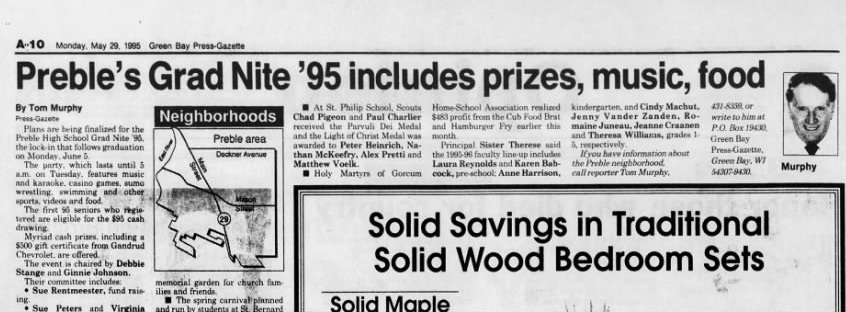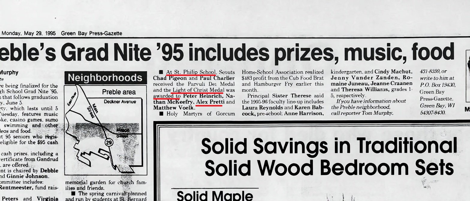 >>527014547>>527014917The Green Bay Press-GazzettePreble's Grad Nite '95 includes prizes, music, foodAt St Philip School Scouts Chad Pigeon and Paul Charlier received the Parvuli Dei Medal and the Light of Christ Medal was to Peter Heinrich, Nathan McKeefry, ALEX PRETTI.— Green Bay Press-Gazzette— PAGE 10— Monday, May 29, 1995 A.D.
