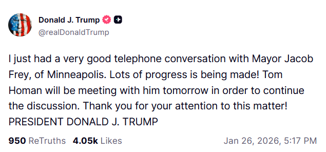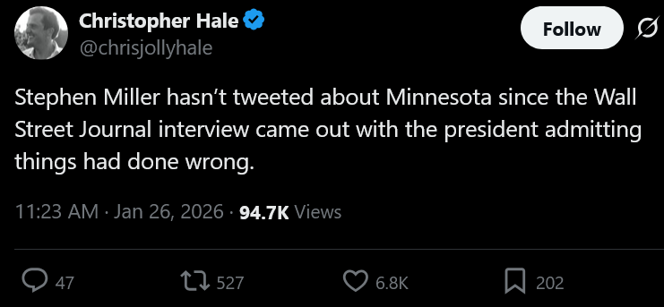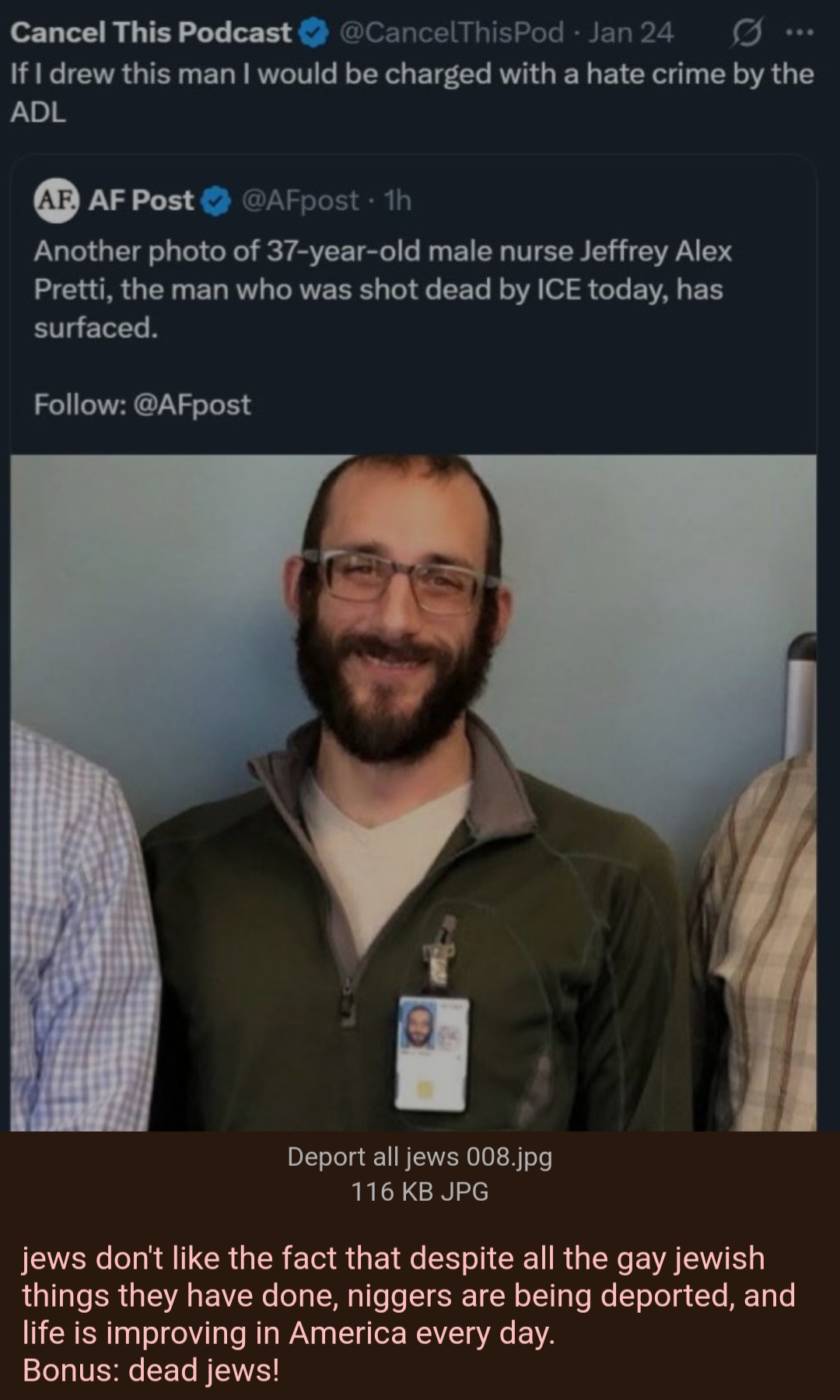 Bullshit. Breaking news: Trump has fired Bovino! Very unhappy with the killing Alex Pretti and how it has made his administration look. Pulling Border Patrol troops from Minnesota. So what do you say now? Is Trump a kike and a tranny as per your earlier stance?
