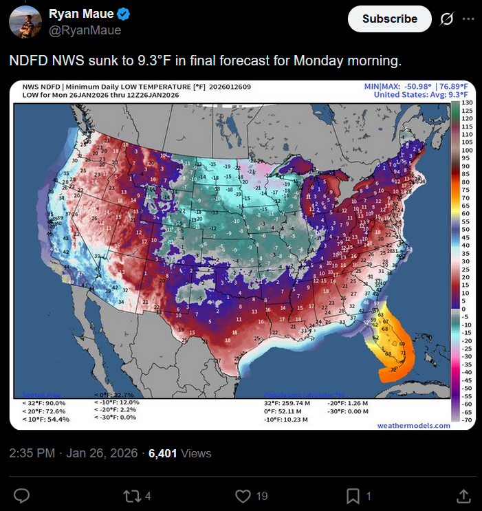 The average low temperature in the lower 48 this morning is 9.3 degrees. Keep in mind, Florida is not participating and has lows around 70 and highs nearing 90. This is an arctic blast that may happen once every 20 years or so, and it's going to last into February. Looking at models, our worst cold will be the last blast in Feb. Unless you live in Florida, keep your butts warm bros.