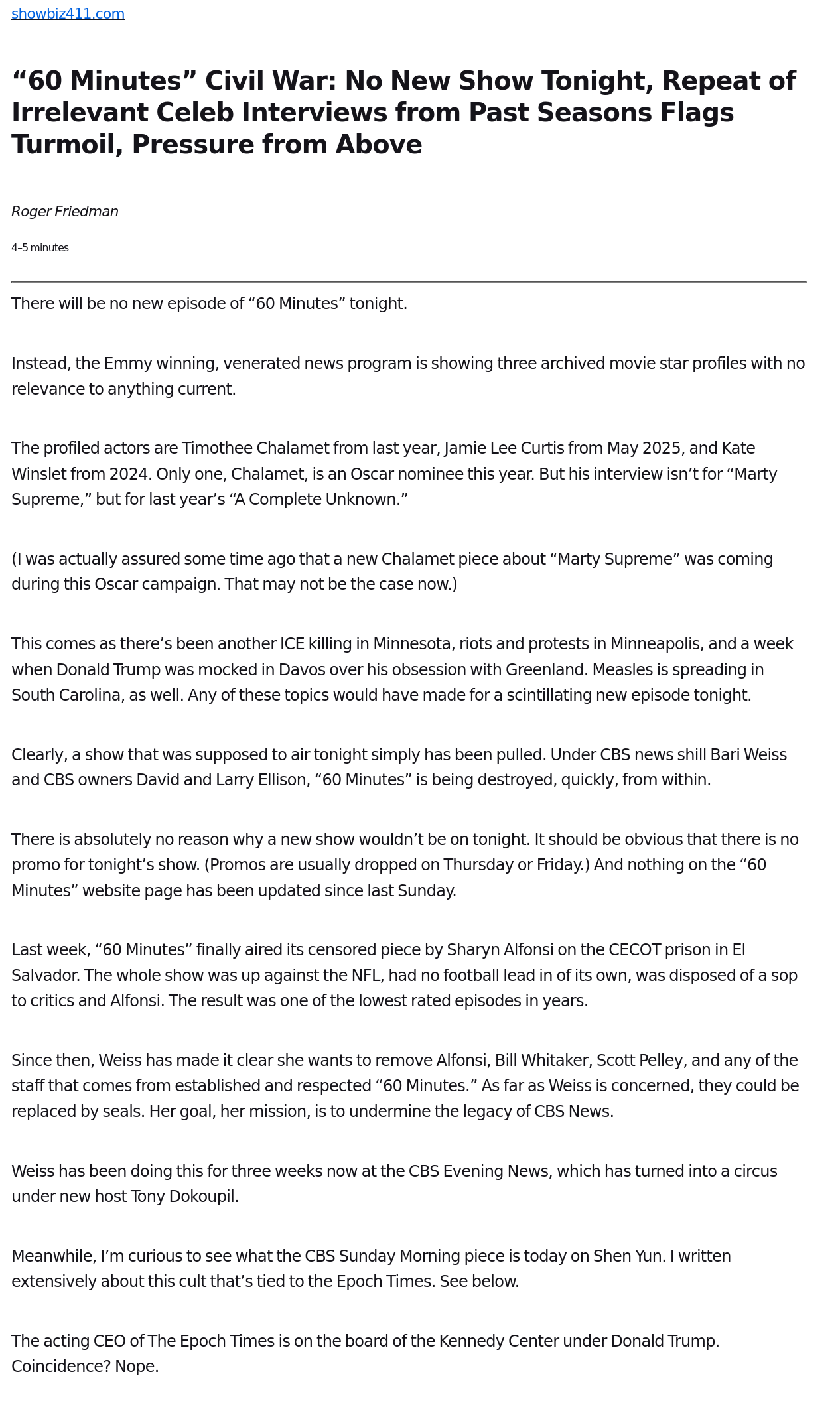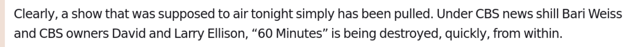 >>527078631>The wealthy peopleyou mean the (((wealthy people)))(((Ellison))) is in the process of enshittifying CBS and reorienting the propaganda of 60 Minutes, (((they))) cancelled 60 Minutes last Sunday