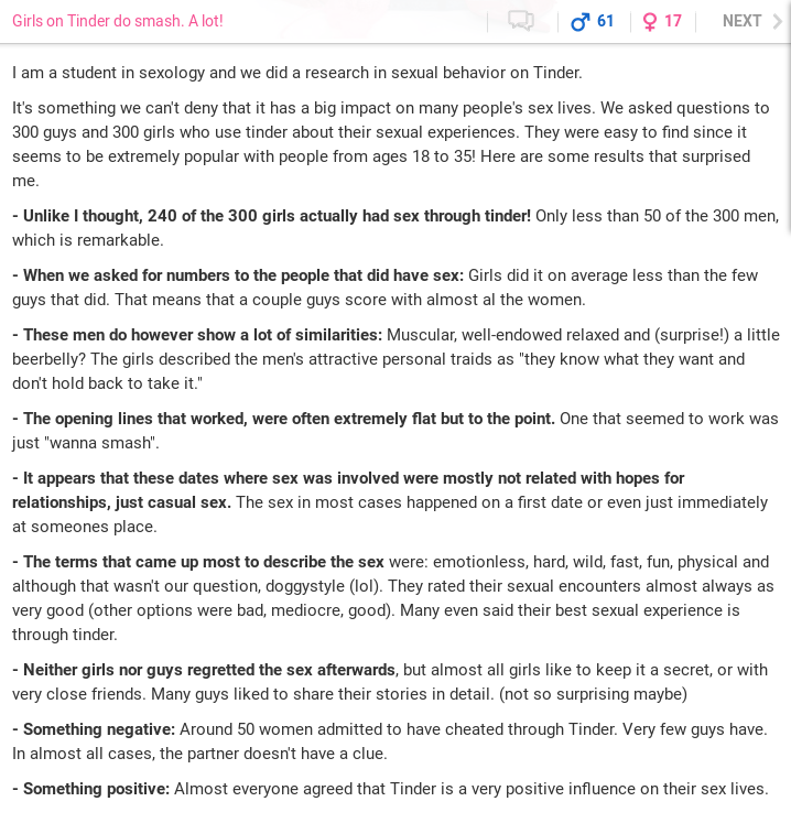 >>527085834There was a study that showed some guy had to make 1.2 million swipes to get an actual physical date that showed up on the day/night.Someone post it.Meanwhile Chad's dick is falling off for all the pussy he is fucking. It's over for incels.