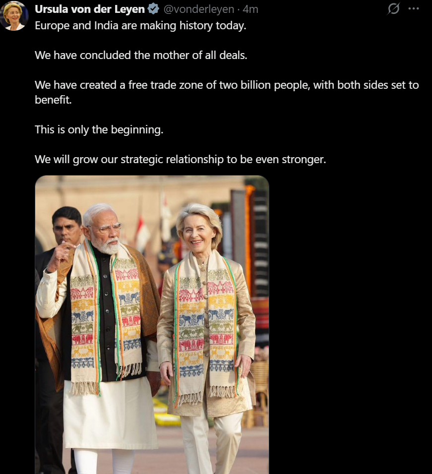 So, India took away the tariffs from euro cars and the EU took away tariffs from indian wine (didn't know this was a thing), textiles and porcessed metals.Seems like a good deal for India, I wonder if the EU will just use this to do the whole, Russian oil is actually indian oil fi we buy it from India" loophole they love so much.