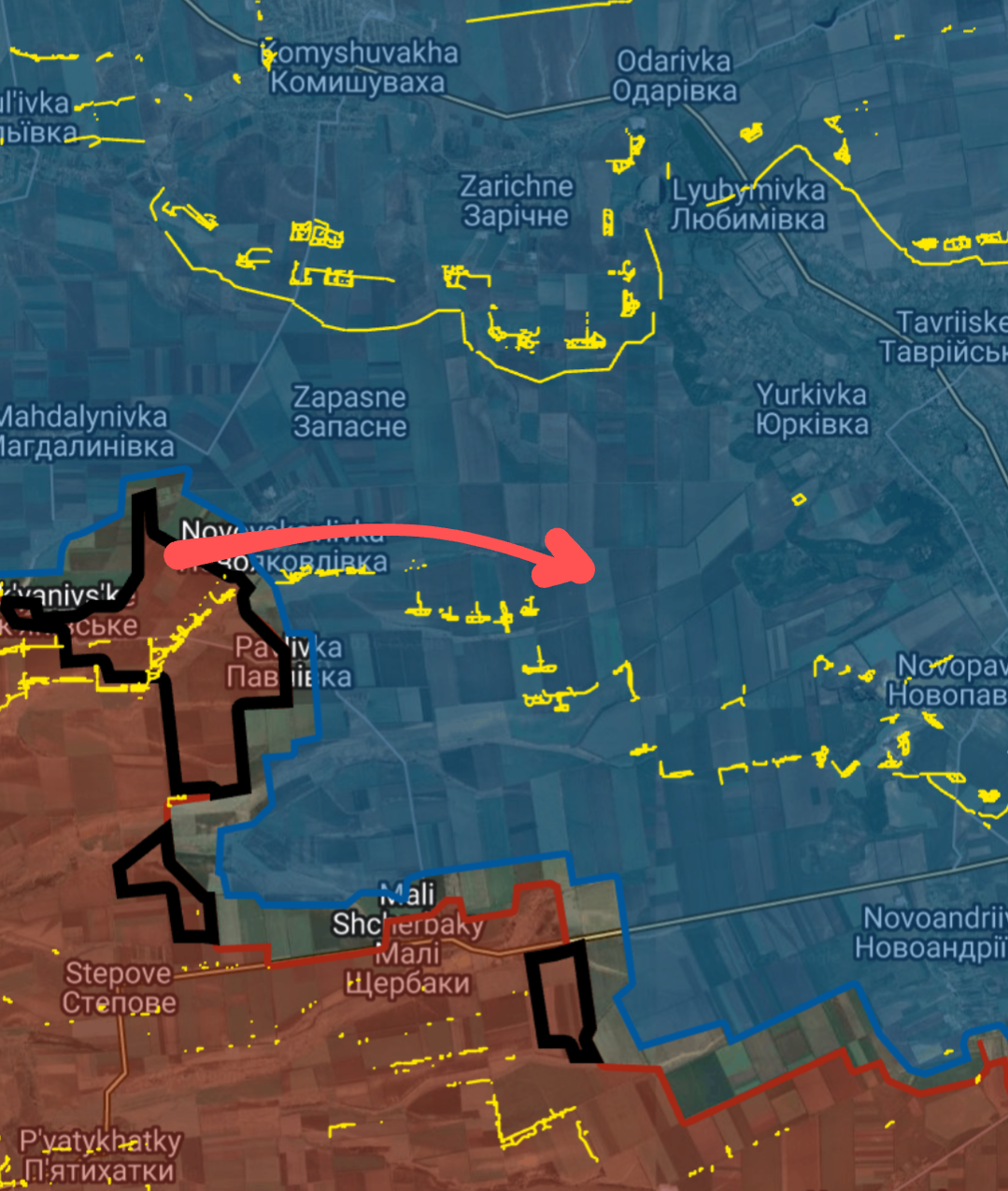 >NovoyakolivkaTown west of Orikhiv in the western Zaporizhia region has been taken.I'm inclined to think the Russians will continue to flank behind the the Ukrainian first line of defence towards Orikhiv