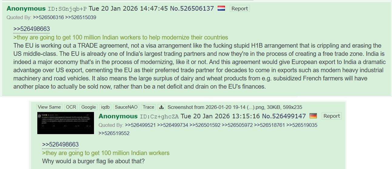 >>527111613It is what it is. They are going to try to pull a Canada on us. Honestly competing with even more workers is not ideal, though beats people from heavily Islamic countries. At least Indians will just fling coconuts at Chrstmas Markets and not drive through them.