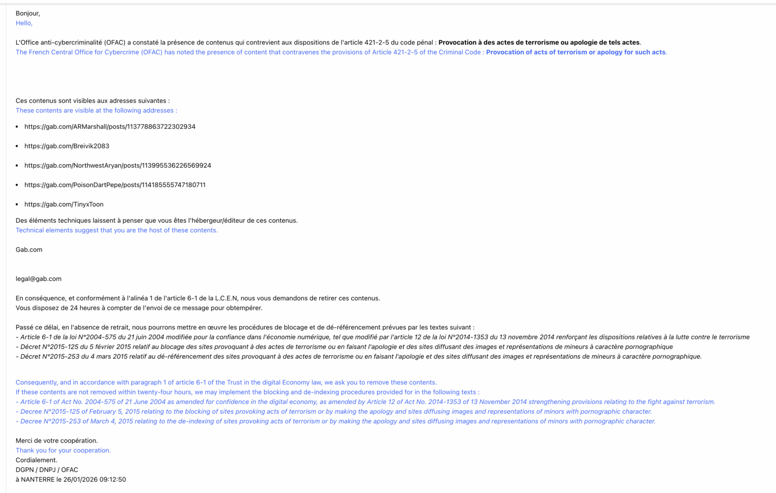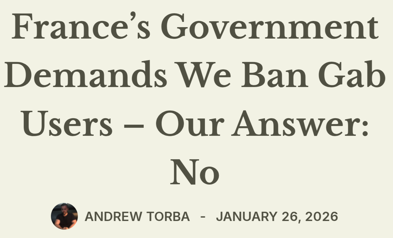 FRANCE IS BANNING GAB!https://news.gab.com/2026/01/frances-government-demands-we-ban-gab-users-our-answer-no/