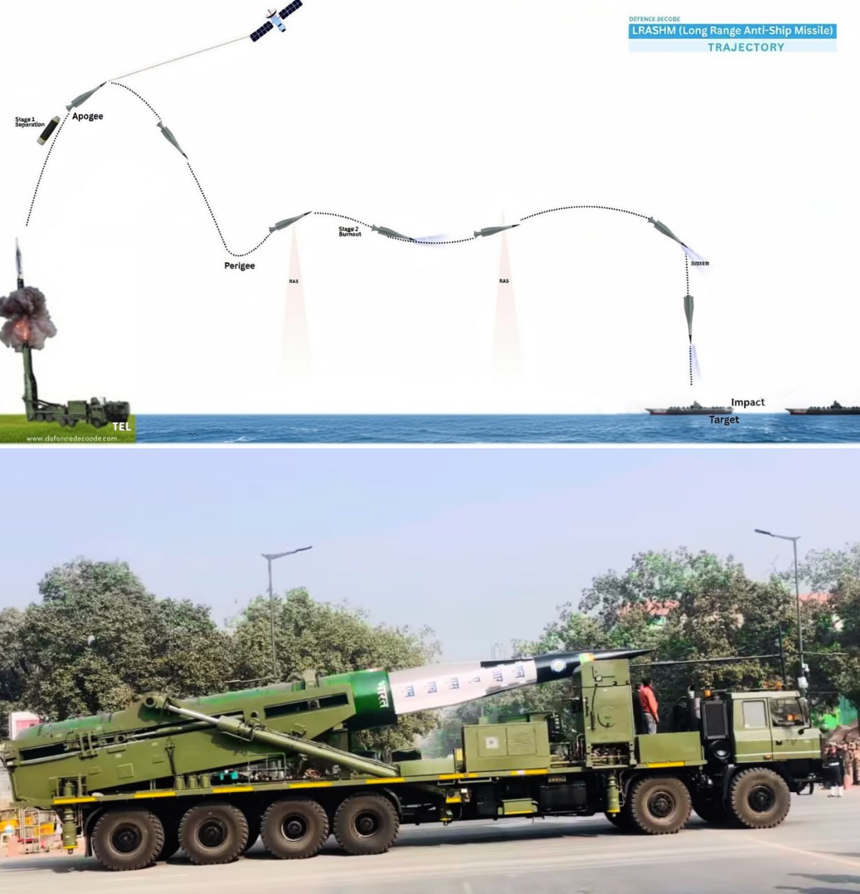 >It was reported that the Indian anti-ship hypersonic missile, the LRAShM (Long Range Anti-Ship Missile), developed by the Defence Research and Development Organisation (DRDO) of the Indian Ministry of Defence, was demonstrated for the first time at a military parade on January 26 in India.>Bharat Dynamics Limited (BDL) is directly responsible for production.>Two flight tests of the LRAShM have been reported to date (in 2023 and November 2024), and its acceptance into service is planned for 2029. The missile is a quasi-ballistic, two-stage, solid-fuel missile (based on the K-15 Sagarika submarine-launched ballistic missile) with a hypersonic guided warhead capable of reaching speeds of up to Mach 5.>The active radar homing head is borrowed from the BrahMos missile.>The missile's range exceeds 1500 km.>The missile is cold-launched from a transport and launch container on a ground-based mobile launcher. >Plans have been announced to develop a ship-based version, as well as a version for the Indian Army to engage ground targets.>even the poo missile is doing this dumb wobble