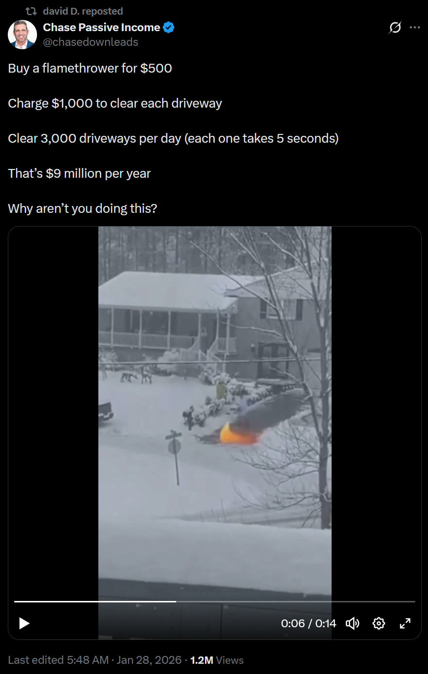 That's a poverty mindset, the true grindset is to charge 100k per driveway and clear 19256 driveways per day, then take all your profits and invest them in crypto.