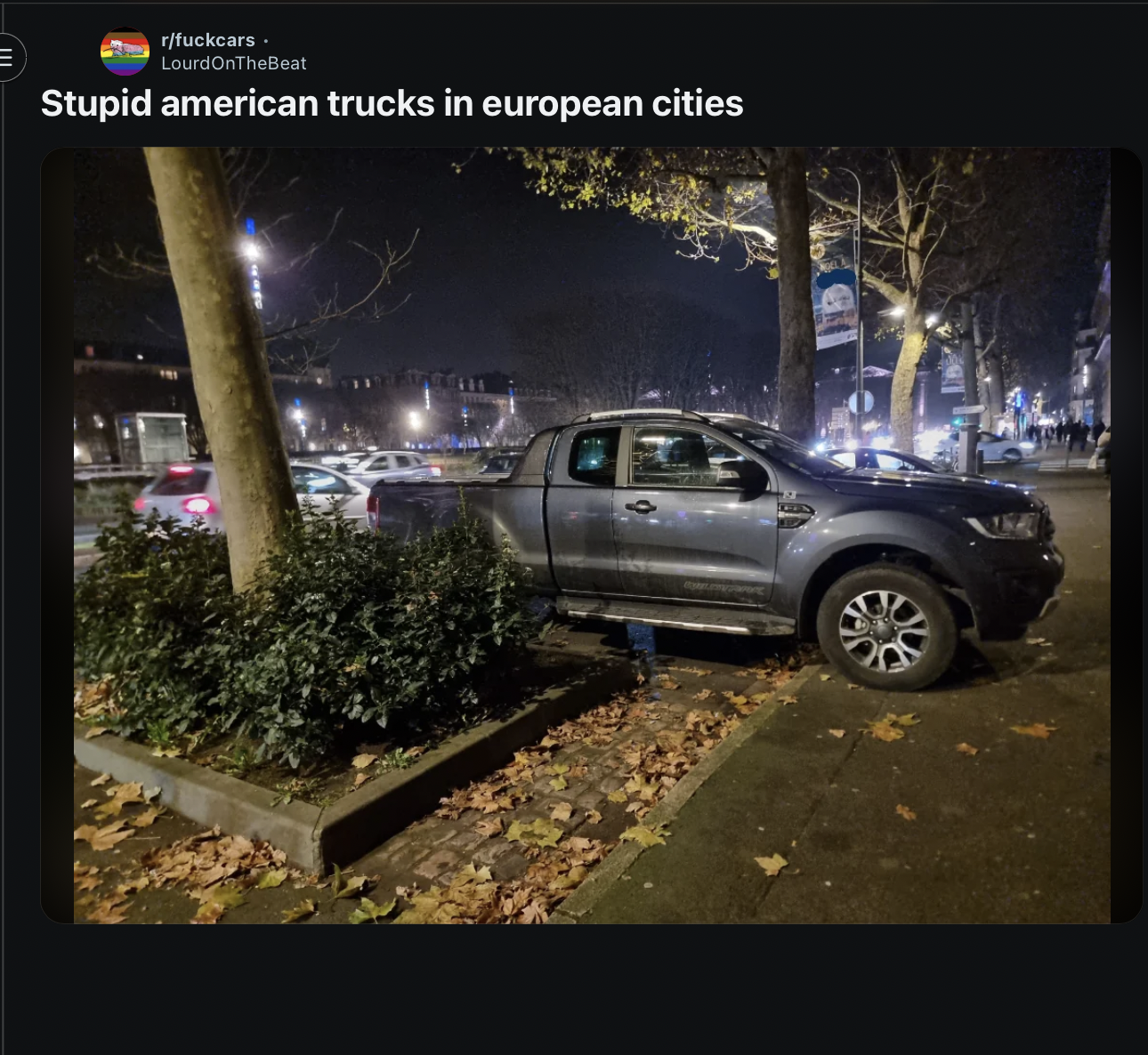 >>527194361You don't need to be a leftist to hate modern trucks. They're excessive in the same way the Heart Attack Grill or all red meat and fat diets are excessive. Bad for the owners, bad for everyone around, entirely performative. No function, just form. If you actually use your giganigga truck then this isn't directed at you but if you're reading this you know EXACTLY the type of person I'm talking about who finances one of those monster trucks and never puts anything bigger than a flatscreen or a Craigslist sofa in the bed, let alone towing or putting any mud and dust on the paint.The truck in that pic is VERY small by modern standards though, I have no idea what the fuck the Reddit OP is complaining about.