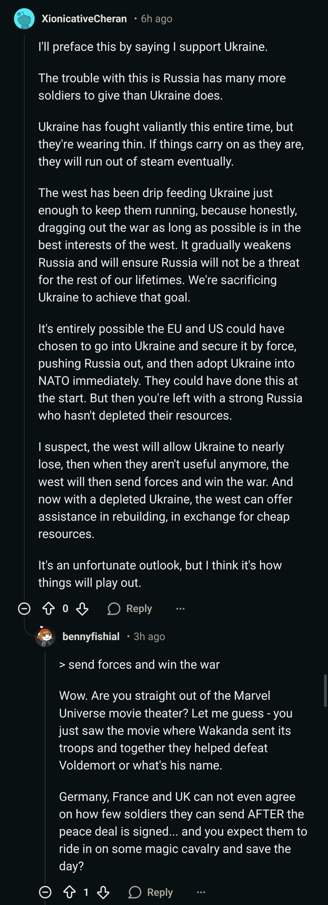>>527234940Actually there are sentiments in the Chinese political commentary sphere (bilibili for one) is calling their government to backstab Russia as the SMO is getting in the right direction in the fear that Russia can finally stand up. However most of the channels think it is stupid because it will not just ruin the relationship and a fracture Russia, even with China getting some part of the resources and territories, will be very dangerous for China. If the Chinese higher up are sane, they wouldn't betray Russia while SMO is ongoing.