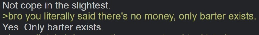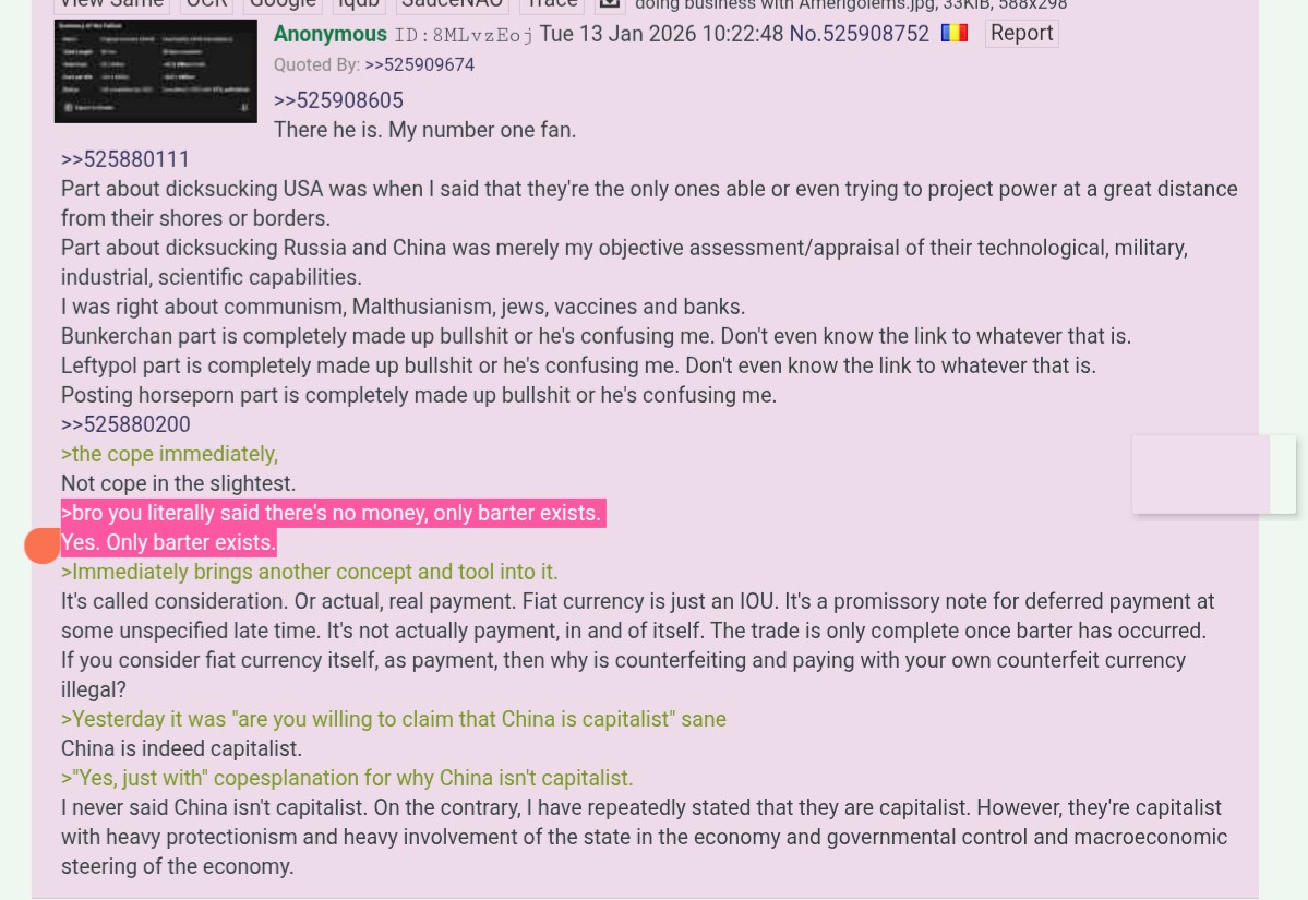 >>527234963>Heh. Even with the fucking screenshots in front of you, you lie about me.Romanian, no matter how many times you try to claim you meant the exact opposite, it'll not change what you said. When that american asked "bro you literally said there's no money, only barter exists." you replied "Yes. Only barter exists." exactly like in his screenshot. The post was here >>525908752This should be the 4th time you try to undo your own words, while boasting that you're and were always right on everything. If you said something wrong, just admit it, and we all move on. Don't keep doubling down on a mistake.