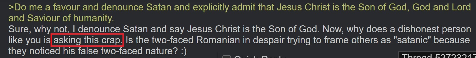 >>527245311>I don't mind that.Mind what? Being a being from hell, filled with lies, dishonest and two-faced error?If this is the case, I shall grant it, from today and forward, you'll be the satanist Romanian, a being from hell. You'll be what you tried, in your dishonesty, to make others to be.