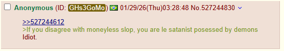 >>527244612>If you disagree with moneyless slop, you are le satanist posessed by demonsIdiot.