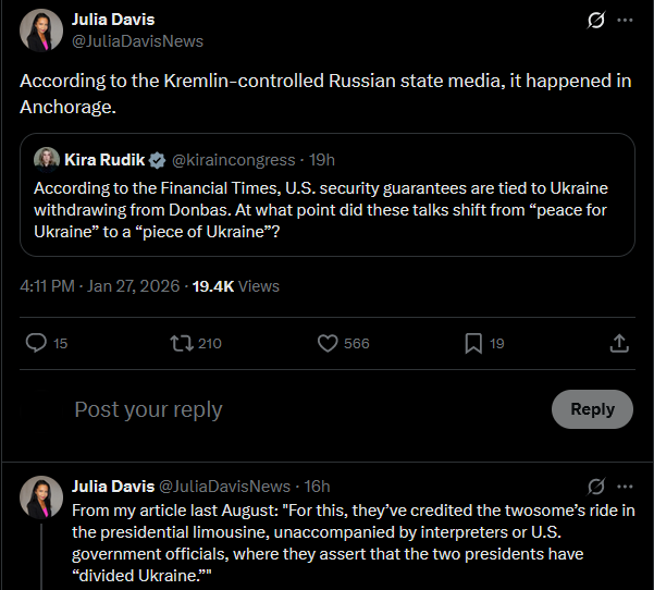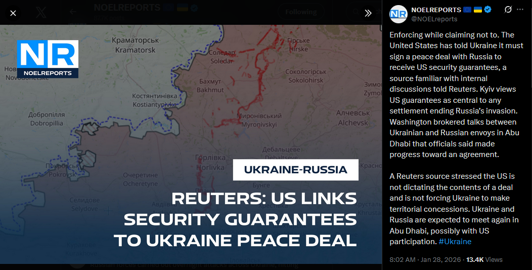 Enforcing while claiming not to. The United States has told Ukraine it must sign a peace deal with Russia to receive US security guarantees, a source familiar with internal discussions told Reuters. Kyiv views US guarantees as central to any settlement ending Russia’s invasion. Washington brokered talks between Ukrainian and Russian envoys in Abu Dhabi that officials said made progress toward an agreement.