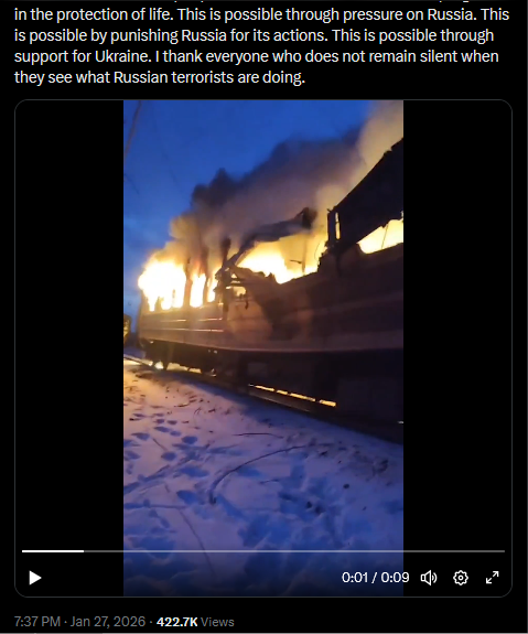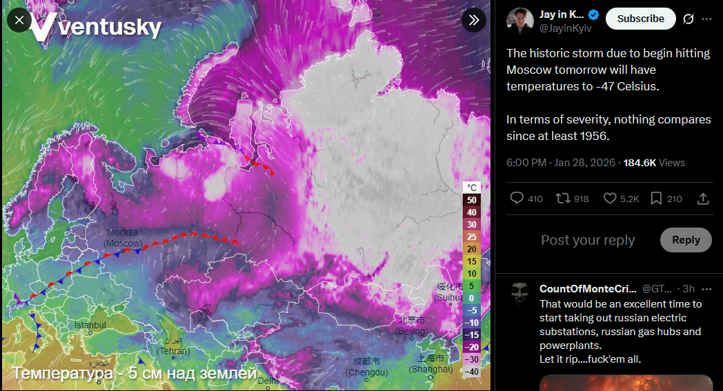 >Blackouts in Murmans'k, Sieveromors'k, Bilhorod, Bryans'k, Orel, Tahanrih, Rostov. Zakams'k is blacked out at -23°C