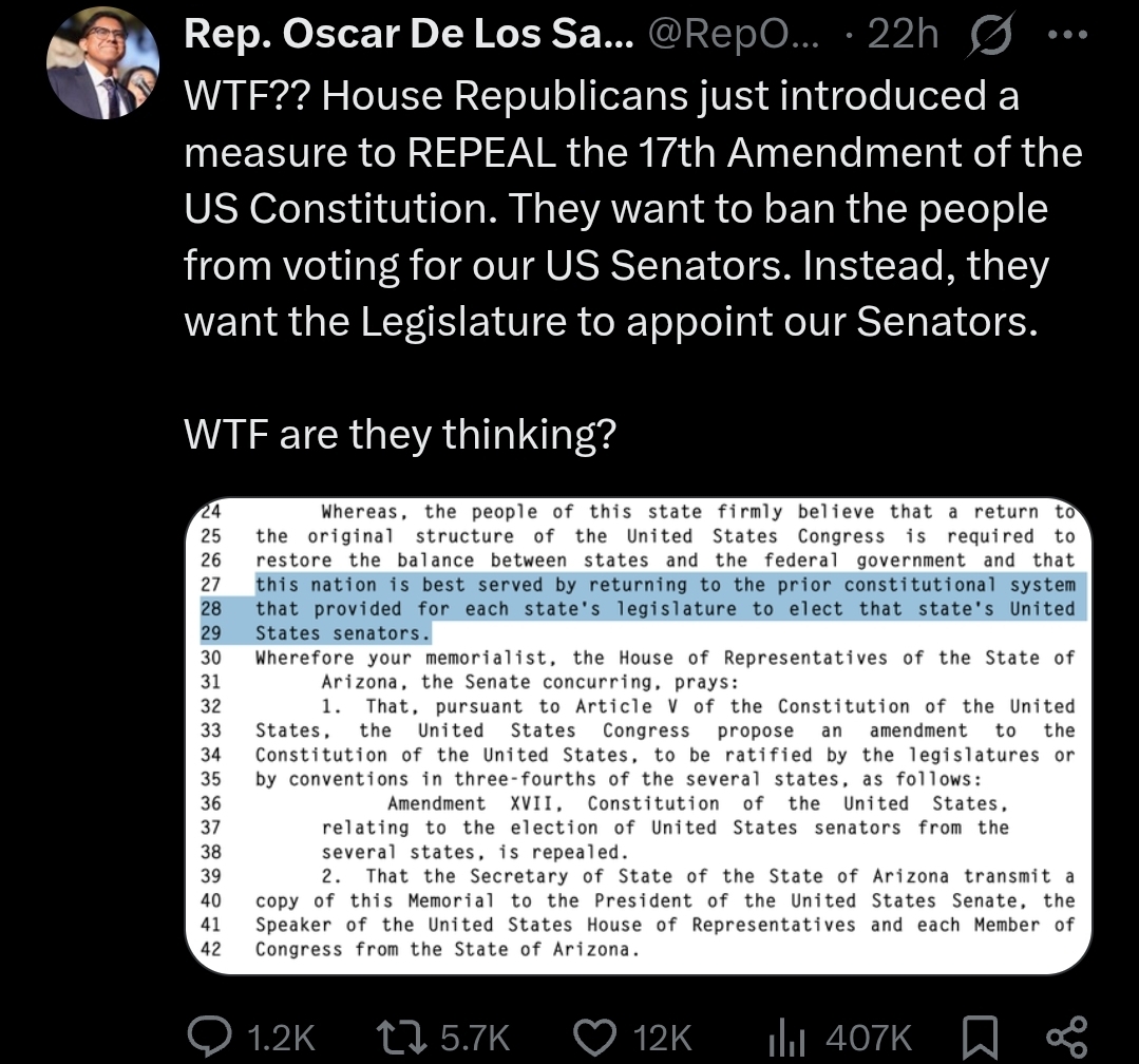 Our senators used to be elected by the state legislatures, not the Congress. The Senate was always meant to represent the rights of the states, not the people. That's why every state gets equal representation on the Senate.