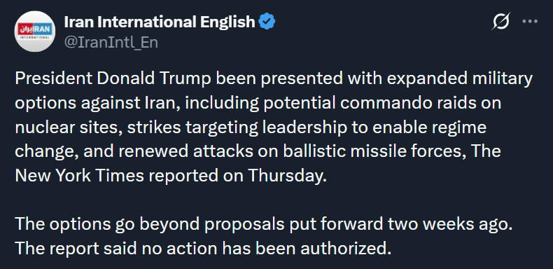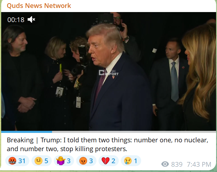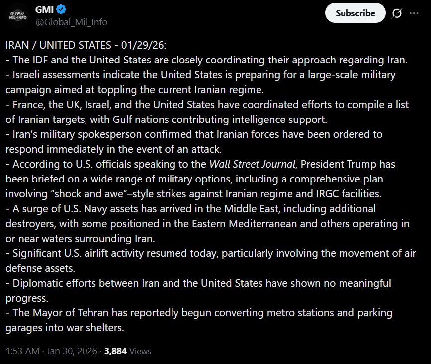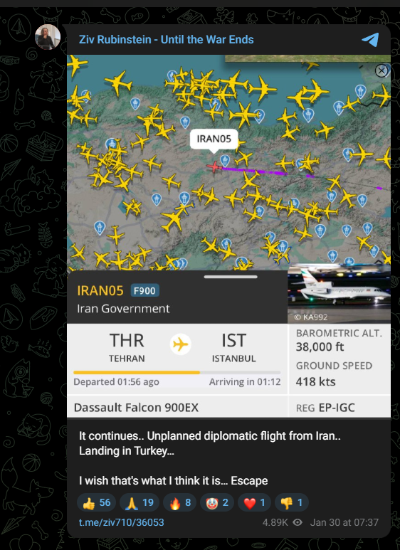 Last: >>526696994ITS OVER for IranIranian News:https://www.aparatchi.com/iran-live-tv/farsi-irib-tv/shabakeh-khabar-liveXitter:https://truthsocial.com/@realDonaldTrumphttps://x.com/Faytukshttps://x.com/sentdefenderhttps://x.com/clashreporthttps://x.com/WW3_MonitorMaps:https://www.flightradar24.com/airport/thrhttps://iran.liveuamap.com/https://geoconfirmed.org/iranTelegram:https://rentry.co/tgnewsSITUATION IN IRAN:>PRETTY FUCKING BAD..>ESTIMATED: >50K DEAD (6.1 Islamic forces) / >100K ARRESTED (potentially to be executed) / >300K INJURED>BLACKOUT ONGOING: No water and power; internet/cell 300+ hours; Starlink actively jammed.TODAY & BREAKING:>plane of high-ranking US officials lands in the UAE>sources indicate that the US is looking for a "quick but deadly" decapitation strike>more US forces are stationed in CENTCOM than before the invasion of Iraq>Unidentified drones over Baghdad>Qatar has requested UK Airforce to station in Qatar under a UK-Qatar defense treaty>in 24 hours the deployment of US forces will have been complete - Israeli Channel 13>Israel cancels leave for soldiers>Israeli military on high alert>Israel says the US will act "within days">Iranian radar in the Shiraz briefly lost contact>Iran is executing prisoners outside the judicial system>EU declares the IRGC a terrorist organization>Trump: "We have a massive armada heading in the direction of Iran">US Navy Lincoln Carrier Group has arrived in the Arabian SeaTIMELINE PASTEBIN: https://pastebin.com/h3yBGGvk