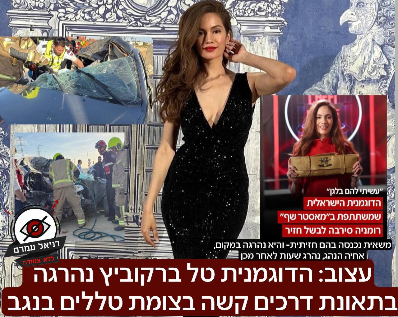 Sad: Model Tal Berkovich was killed in a severe car accident at the Talalim junction in the Negev: Tal Berkovich, 41, an Israeli model and actress who moved to LA, was killed yesterday in a serious head-on collision when she and her brother were in their car on the way to their mother's birthday. Her brother, the driver, made a turn at the Talalim junction in the Negev, which is known to be dangerous, and a truck driver collided with them head-on. The right side where Tal was sitting was completely crushed and she died at the scene. Her brother was taken in serious condition and later died in the hospital. Veterans in the entertainment world know her as a successful model and actress in Israel until she became religious and started baking in LA. Recently, she starred in MasterChef Romania, where she made headlines for refusing to cook pork. On a personal note, I knew Tal; she was a fighter, a lioness, dreamed so much of getting married and having children, loved the State of Israel with all her heart, and her life was simply cut short in an instant. May her memory be blessed.